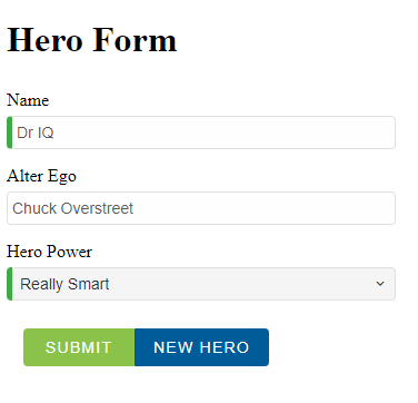 <div [hidden]="submitted" class="container"> <h1>Hero Form</h1> <form [formGroup]="heroForm" (ngSubmit)="onSubmit()"> <div class="form-row"> <label for="name">Name</label> <smart-input required class="form-component" formControlName="name"> </smart-input> <div *ngIf="name.invalid && (name.dirty || name.touched)" class="alert alert-danger"> <div *ngIf="name.errors.required"> Name is required. </div> <div *ngIf="name.errors.minlength"> Name must be at least 4 characters long. </div> <div *ngIf="name.errors.forbiddenName"> Name cannot be Bob. </div> </div> <div class="form-row"> <label for="alterEgo">Alter Ego</label> <smart-input class="form-component" formControlName="alterEgo"> </smart-input> </div> <div class="form-row"> <label for="power">Hero Power</label> <smart-drop-down-list required class="form-component" formControlName="power" required> <smart-list-item *ngFor="let pow of powers" [value]="pow">{{pow}}</smart-list-item> </smart-drop-down-list> <div [hidden]="power.valid || power.pristine" class="alert alert-danger"> Power is required </div> </div> <div class="smart-stack-layout"> <smart-button [disabled]="!heroForm.valid" type="submit" class="success item">Submit</smart-button> <smart-button type="button" (click)="newHero(); heroForm.reset()" class="primary item">New Hero </smart-button> </div> </div> </form> </div> <div [hidden]="!submitted"> <h2>You submitted the following:</h2> <div class="row"> <div class="col-xs-3">Name</div> <div class="col-xs-9">{{ name.value }}</div> </div> <div class="row"> <div class="col-xs-3">Alter Ego</div> <div class="col-xs-9">{{ alterEgo.value }}</div> </div> <div class="row"> <div class="col-xs-3">Power</div> <div class="col-xs-9">{{ power.value }}</div> </div> <br> <smart-button class="primary" (click)="submitted=false">Edit</smart-button> </div> <br /><br /> <h2>Changes Log:</h2> {{diagnostic}} -