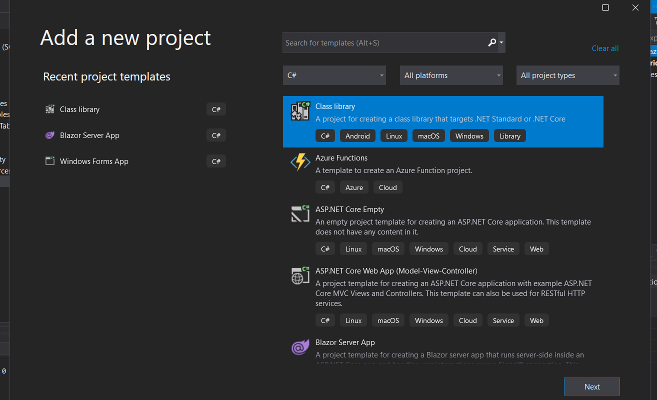 - Inside the Solution Explorer, right-click on your Solution and add a new project of type Class Library and call it DataAccessLibrary