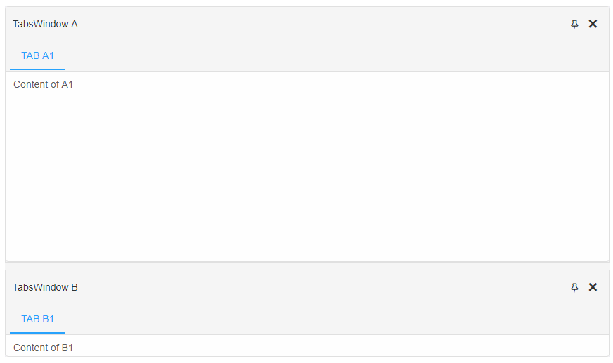 const itemGroup = { //A Panel Group type: 'LayoutGroup', orientation: 'horizontal', size: 25%, resizeMode: 'none', items: [ { //DockingLayout Item A type: 'LayoutPanel', label: 'TabsWindow A', size: '50%', items: [{ //Tab Item A1 of Item A label: 'Tab A1', content: 'Content of A1' }] }, { //DockingLayout Item B type: 'LayoutPanel', label: 'TabsWindow B', size: '50%', items: [{ //Tab Item B1 of Item B label: 'Tab B1', content: 'Content of B1' }] } ] };The LayoutGroup contains two LayoutPanels - 'TabsWindow A' and 'tabsWindow B'. Each panel has one TabItem - 'Tab A1' and 'Tab B1' with content set. LayoutGroup properties can be applied the same was as with LayoutPanels since they are also DockingLayout items. LayoutGroups have some additional properties like orientation and resizeMode. Items property of a 'LayoutGroup' defines the LayoutPanels of that group.