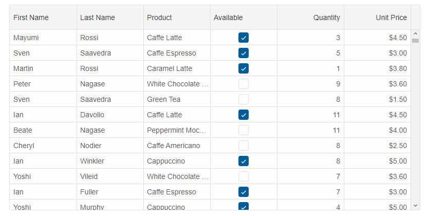 columns: [ { label: 'First Name', dataField: 'firstName' }, { label: 'Last Name', dataField: 'lastName' }, { label: 'Product', dataField: 'productName' }, { label: 'Available', dataField: 'available', template: 'checkBox', editor: 'checkBox' }, { label: 'Quantity', dataField: 'quantity', editor: 'numberInput' }, { label: 'Unit Price', dataField: 'price', editor: 'numberInput', cellsFormat: 'c2' } ]