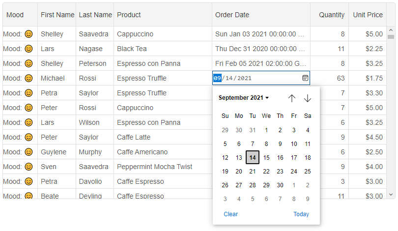 columns: [ { label: 'Mood', dataField: '', editor: { template: '#moodEditorTemplate', onInit(index, dataField, editor) { editor.addEventListener('click', function (event) { editor.firstElementChild.value = event.target.innerHTML; }); } }, width: 70, align: 'left', template: '#moodTemplate', }, { label: 'First Name', dataField: 'firstName', editor: '<input/>' }, { label: 'Last Name', dataField: 'lastName', editor: '<input/>' }, { label: 'Product', width: 200, dataField: 'productName', editor: '#template' }, { label: 'Order Date', width: 200, dataField: 'date', editor: '<input type="date"/>' }, { label: 'Quantity', dataField: 'quantity', editor: '<input type="range"/>' }, { label: 'Unit Price', dataField: 'price', editor: '<input type="number"/>', cellsFormat: 'c2' } ]