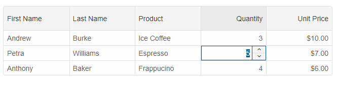 columns: [ { label: 'First Name', dataField: 'firstName', editor: 'input' }, { label: 'Last Name', dataField: 'lastName', editor: 'autoComplete' }, { label: 'Product', dataField: 'productName', template: 'dropDownList', editor: { template: 'comboBox', dataSource: ["Black Tea", "Green Tea", "Caffe Espresso", "Doubleshot Espresso", "Caffe Latte", "White Chocolate Mocha", "Caramel Latte", "Caffe Americano", "Cappuccino", "Espresso Truffle", "Espresso con Panna", "Peppermint Mocha Twist"] } }, { label: 'Quantity', dataField: 'quantity', cellsAlign: 'right', editor: 'numberInput' }, { label: 'Unit Price', dataField: 'price', cellsAlign: 'right', cellsFormat: 'c2', editor: { template: 'numberInput' } } ]