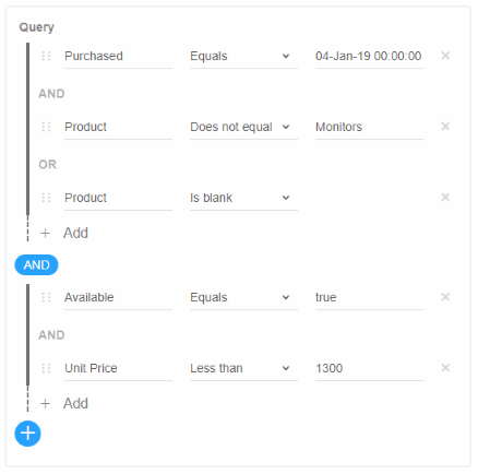 Smart.QueryBuilder represents a control for building filter queries. Queries with multiple groups of conditions and different operators can be created.