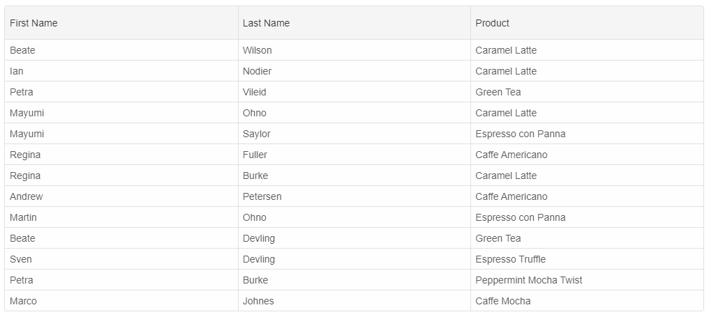 { "firstName": "Regina", "lastName": "Burke", "productName": "Caramel Latte"},